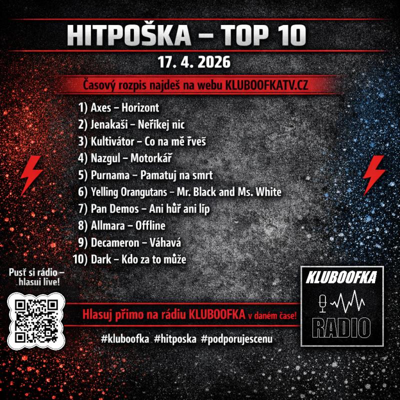 Interaktivní hitparáda Hitpoška, kterou vysílá Rádio Kluboofka, vstoupila do své druhé poloviny. Projekt probíhá od 20. března do 18. května 2026 a nabízí prostor pro české a slovenské rockové a metalové kapely, které soutěží o podporu fanoušků v živém vysílání. Zveřejňujeme aktuální pořadí po první části soutěže.