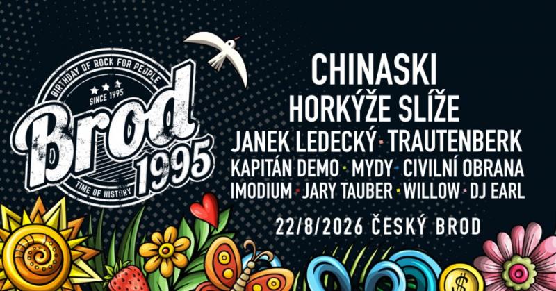 Festival Brod 1995 již třináctým rokem neodmyslitelně patří k letní festivalové sezóně. V sobotu 22. srpna 2026 nabídne v Českém Brodě opět jednodenní přehlídku toho nejlepšího z česko-slovenské hudební scény napříč žánry, od nejrůznějších podob rocku přes pop až po elektroniku. Návštěvníci se mohou těšit především na energickou show stálice českého pop-rocku Chinaski, která patří k vrcholům letošního programu. Silnou dávku punkrockové energie i jadrné texty přiveze slovenská legenda Horkýže Slíže, zatímco charismatický zpěvák a skladatel Janek Ledecký nabídne průřez svými největšími hity. Program doplní také originální a žánrově neuchopitelný Kapitán Demo, který je zárukou nezaměnitelné show, nebo energická kapela MYDY kombinující elektroniku, pop a taneční prvky. Chybět nebude ani osobitý humor a tvrdší rock v podání kapely Trautenberk, návrat oblíbené rockové formace s emotivním rukopisem Imodium či punkrocková Civilní obrana.